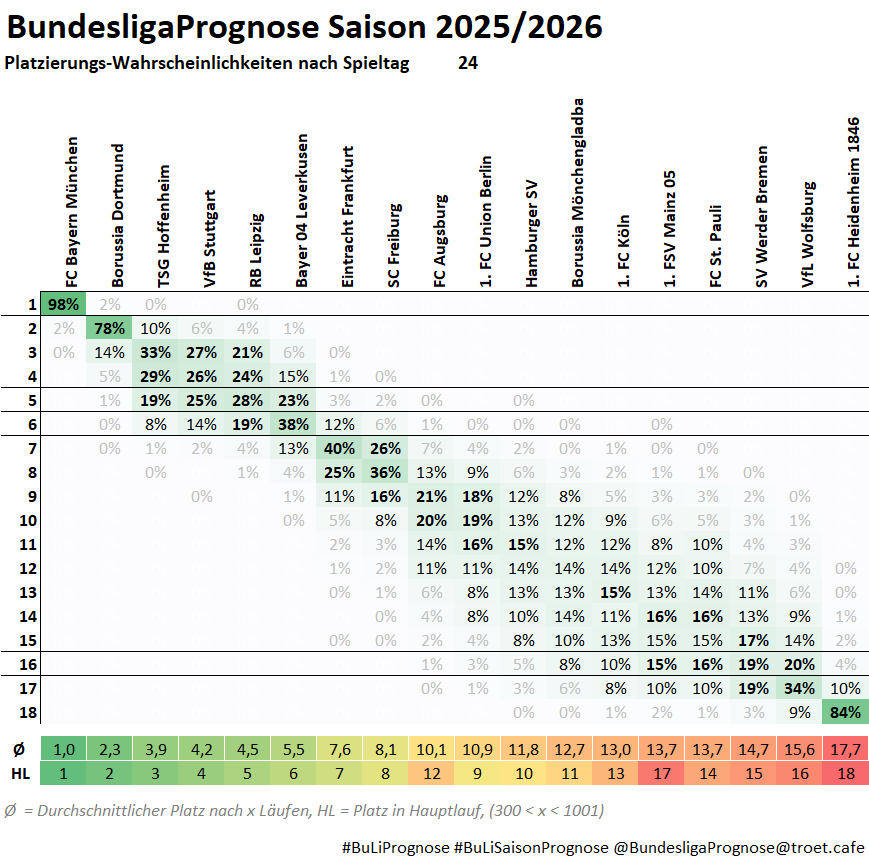 #BuLiSaisonPrognose: Auf welchen Plätzen landen die Bundesliga-Teams am Ende der Saison? Wahrscheinlichkeiten nach dem 24. Spieltag: