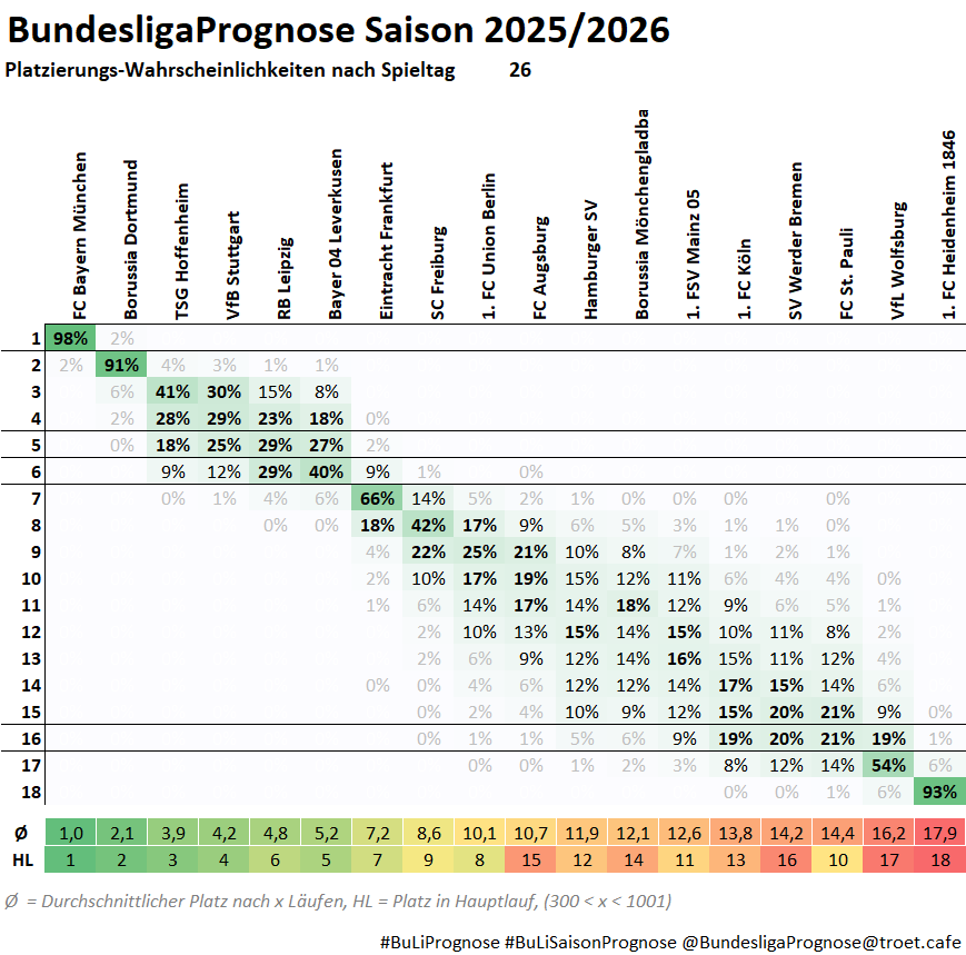 #BuLiSaisonPrognose: Auf welchen Plätzen landen die Bundesliga-Teams am Ende der Saison? Wahrscheinlichkeiten nach dem 26. Spieltag: