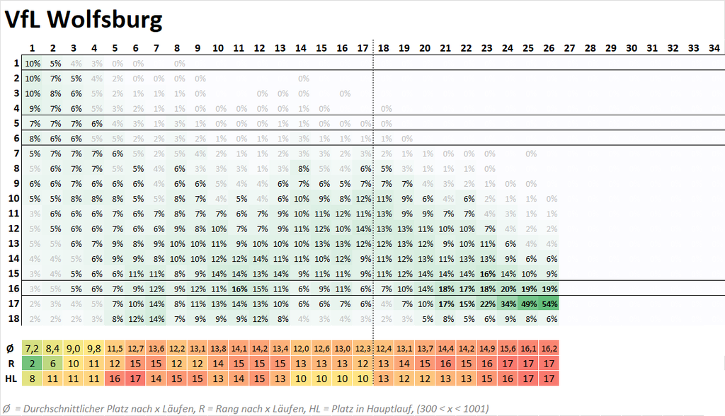 5️⃣ 5 Teams nun mit einer Wahrscheinlichkeit für einen bestimmten Platz >50%. Neu dabei: Der #VfLWolfsburg mit 54,3% auf Platz 17.