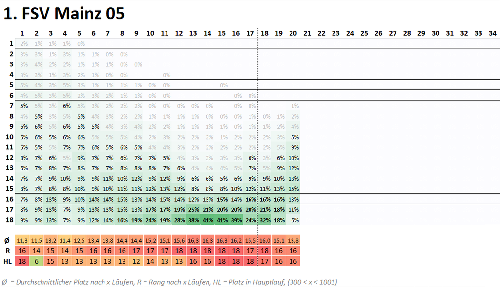 👉 Die Abstiegswahrscheinlichkeit ist unter ein Drittel (30%) gesunken. Zwischen dem 13. & 18. Spieltag lag sie meist über zwei Drittel (76% am 15. Spieltag)